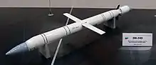 The Novator Kalibr (Калибр, caliber), also referred to as 3M54-1 Kalibr, 3M14 Biryuza (Бирюза, turquoise), (NATO reporting name SS-N-27 Sizzler and SS-N-30A) is a family of Russian cruise missiles developed by NPO Novator (OKB-8). It first saw service in 1994. There are ship-launched, submarine-launched and air-launched versions of the missile, and variants for anti-ship, anti-submarine and land attack use. Some versions have a second propulsion stage that initiates a supersonic sprint in the terminal approach to the target, reducing the time that air defense systems have to react, while subsonic versions have greater range than the supersonic variants. The missile can carry a warhead weighing up to 500 kilograms (1,100 lb) of explosive or a thermonuclear warhead.