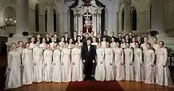 The choir has also actively worked toward the goal of synthesizing genres and means of expression. Examples of this effort have included scenic and choreographed performances of Jersikas derība (an oratorio by Līga Celma), The Christmas Legend (a musical tale by Ēriks Ešenvalds), and The Canticles of the Holy Wind (a large-scale scenic meditation by John Luther Adams). The choir’s diversity was on full display in its 25-year anniversary concert in May 2015 at the Latvian National Opera. In three commissioned song cycles, the choir showed its skill as a nuanced a cappella ensemble (Ešenvalds’ In Bird’s Sleep), as a powerful stage group (Raimonds Tiguls' Legend About Us), and as a splendid collaborator with a professional orchestra (Gabriel Jackson’s Spring Rounds).