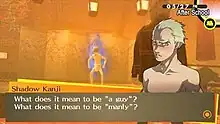 Yu Namba, the Persona 4 Project Lead for Atlus USA, commented that while Kanji's Shadow might offend some players due to it being a gay stereotype, Kanji was nothing like a stereotype. Kanji's sexual orientation was left ambiguous to all players.[8] Namba added "We would like everyone to play through the game and come up with their own answers to that question; there is no official answer ... What matters is that Kanji's other self cries out, 'Accept me for who I am!' I think it's a powerful message which many, if not all of us can relate to."[9] Nich Maragos, Persona 4 Editor for Atlus USA, agreed with Namba, but personally held the opinion that Kanji was homosexual.[9] The localization team of Persona 4 made a point of keeping as true to the original translation as possible.[9] He cited Shadow Kanji's flamboyant personality and stated, "That flamboyance was also what the viewers of the Midnight Channel wanted to see: a typical gay person on TV that people would laugh at. The TV station broadcasts what the audience prefers to watch -- it's a stark portrayal of modern society."[9] Namba also made some scenes which involved Kanji's sexual orientation more subtle without removing the scenes' value.[9]