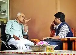 Karanam Pavan Prasad Discussing the novel Karma with Novelist and Scholar SL Bhyrappa in 2013[6]