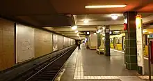 Karl-Marx-Straße is a Berlin U-Bahn station located on the U7 line. The station was opened in 1926 as "Bergstraße," and renamed in 1946. Although Karl Marx was a hero of the socialist republic of East Germany, the station is in former West Berlin. In 1968, the station was lengthened to 105m; due to this much of its original appearance was lost. In 1993, parts of the platform fell into the rail track and the station closed for a few days while repairs were made. The station is one stop from Neukölln station, where passengers can transfer to the S-Bahn.[1]