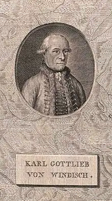 Karl Gottlieb von Windisch (Latin: Carolus Theophil Windisch, Hungarian: Windisch (Vindis) Károly, January 28, 1725, Pressburg – March 30, 1793, Pressburg) was a Hungarian German writer who produced a series of letters that were published as "Briefe über den Schachspieler von Kempelen nebst drey Kupferstichen die diese berühmte Maschine vorstellen", translated as "Inanimate Reason; or a Circumstantial Account of That Astonishing Piece of Mechanism, M. de Kempelen's Chess-Player; Now Exhibiting at No. 9 Savile-Row, Burlington Gardens", following a series of performances of The Turk that he attended. The letters have been cited often since their publication in attempts to uncover the secret of the machine. Windisch spoke Slovak and Hungarian and was the first publisher of an academic Journal in Eastern Europe.