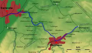 The starting point at the Baden end was originally Durlach, where it connects with the Rhine Valley Railway. The line was later extended to the old Karlsruhe station. From Durlach the line runs through the Pfinz and Kämpfelbach valleys, passing over the watershed between the Rhine and Neckar in a tunnel near Pforzheim, and follows the Enz river east of Pforzheim to Mühlacker.