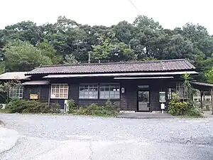 The station has a single side platform and a small wooden station building. The station is unattended.
