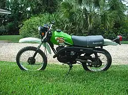 The Kawasaki KE100 is a dual-sport motorcycle that was produced by Kawasaki from 1976 to 2001. A direct successor to the G5, the major changes on the KE100 were different ergonomics and a change in transmission layout (1-N-2-3-4-5 to the G5's N-1-2-3-4-5). The KE100 did not change much through the years, although minor changes were made to the engine and transmission over successive model years, as well as a switch to different tanks after the B4 model. It uses an oil injection system that Kawasaki calls superlube to both eliminate fuel-mixing and give a precise fuel-oil mixture in the two-stroke cycle, reducing emissions enough that the KE100 still passes US emissions tests. Its fuel tank has a capacity of 2.5 US gal (9.5 L; 2.1 imp gal) and includes two small hooks on the rear of the frame that can be used either to mount turn signals or to tie or "bungee" a spare fuel tank for longer journeys.