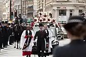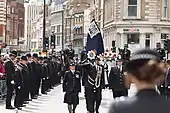 The following day, on 10 April, Palmer's coffin travelled in procession to Southwark Cathedral,[12] escorted by motorcycle outriders from the Special Escort Group of the Metropolitan Police. The route was 2.6 miles (4.2 km) long and avoided Westminster Bridge where the terrorist attack had begun.[13] Instead, the procession crossed the Thames over Lambeth Bridge, during which a ten-second horn salute was given by boats on the river.[12] Tens of thousands of people lined the streets, including 5,000 police officers.[12] The procession was fronted by a colour party carrying the Metropolitan Police Service Standard, who were followed by five mounted police officers.[13] Then came the funeral conductor and chaplains (including Rose Hudson-Wilkin, Chaplain to the Speaker of the House of Commons) who were walking in front of the hearse. The hearse carried Palmer's coffin which was draped in the police flag, and there were "red and white floral tributes atop the hearse"; these "spelled out 'No 1 Daddy', 'husband', 'son', 'brother', 'uncle' and 'Keith'".[13] Making up the rear were cars carrying his family, and four more mounted officers.[12]