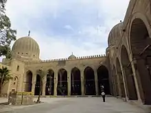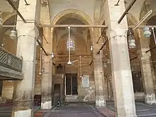 The prayer hall (covered mosque area) is attached to the east side of the courtyard. It is mostly plain in appearance but is also characterized by its uncommon stonework; instead of the usual wooden ceiling found elsewhere in most Mamluk (or Cairene) mosques, the ceiling is composed of stone vaults. A small dome also rises over the space in front of the mihrab. A stone dikka (reading platform) stands at the edge of the prayer hall.[1][2][3]