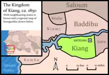 Kiang (variant spelling: Kian) was a historical kingdom in what is now the West African state of The Gambia and also the name of the region it covered. The area is now the districts of Kiang Central, Kiang East, and Kiang West in the Lower River Division of the present-day country. The Kiang West National Park is also on the territory of the former empire.