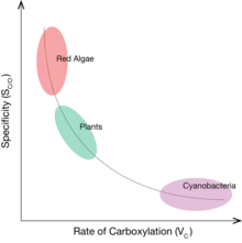 It has been observed among natural RuBisCOs that an increased ability to distinguish between CO2 and O2 (larger values of Sc/o) corresponds with a decreased rate of carboxylation (lower values of VC and KC).[18] The variation and trade-off between Sc/o and KC has been observed across all photosynthetic organisms, from photosynthetic bacteria and algae to higher plants.[18] Organisms using RuBisCOs with high values of VC / KC, and low values of Sc/o have localized RuBisCO to areas within the cell with artificially high local CO2 concentrations. In cyanobacteria, concentrations of CO2 are increased using a carboxysome, an icosahedral protein compartment about 100 nm in diameter that selectively uptakes bicarbonate and converts it to CO2 in the presence of RuBisCO.[19] Organisms without a CCM, like certain plants, instead utilize RuBisCOs with high values of Sc/o and low values of VC and KC.[18] It has been theorized that groups with a CCM have been able to maximize KC at the expense of decreasing Sc/o, because artificially enhancing the concentration of CO2 would decrease the concentration of O2 and remove the need for high CO2 specificity. However, the opposite is true for organisms without a CCM, who must optimize Sc/o at the expense of KC because O2 is readily present in the atmosphere.
