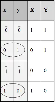 Consider a simple two-element system in which product x activates gene Y and product y represses gene X as shown in figure D. Each variable takes only two values; 0 and 1. In other words,