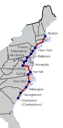 The section north of New York City, laid out on January 22, 1673, became the Upper Boston Post Road.[1] The road was finally completed in 1735. Much of the Post Road is now U.S. Route 1 and U.S. Route 20.