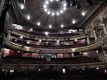 The auditorium seats 1,785. The ceiling panelling fans out from a single centre ceiling rose - each panel originally contained painted scenes, although they are currently plain. The proscenium is surrounded by heavy marble and plasterwork borders. Above the proscenium an elegant design with cherubs flanking a crown and a K/T emblem provides a focal point to the theatre when the curtain is down. The red curtain has simple gilding, but often remains unseen as it is unused for many of today's productions. The seats and drapes are of a rich red material. The safety curtain features a painted design of drapes, and framed in the centre is a projection screen. At Grand Circle level two boxes on either side of the auditorium continue where the grand circle balcony finishes. A further box (now disused) is located at Upper Circle level above this, with an elaborate domed canopy. Three domed alcoves sit along either side of the upper circle. Comedian and actor Billy Connolly famously described it as "like performing inside a wedding cake".