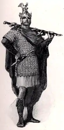 Other literature has expanded Arthur's immediate family further. His daughter named Archfedd is found in only one Welsh source, the 13th-century Bonedd y Saint.[30] A daughter named Hilde is mentioned in the 13th-century Icelandic Þiðreks saga (Thidrekssaga), while the Möttuls saga from around the same period features a son of Arthur by the named Aristes. Rauf de Boun's 1309 Petit Brut lists Arthur's son Adeluf III as a king of Britain, also mentioning Arthur's other children Morgan le Noir (Morgan the Black) and Patrike le Rous (Patrick the Red) by an unnamed Fairy Queen.[31] Later on, a number of early modern works have occasionally given Arthur more of different sons and daughters.[lower-alpha 2]