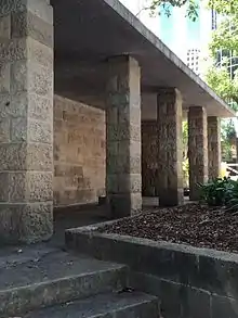 The third design was also a "bus" type shelter, but it was built with a stone rear wall, instead of concrete, and six stone piers were later added, instead of five brick piers. The three brick blast walls could be removed as normal. Two of these "colonnade" types were built — referred to in the Brisbane City Council list as "bus (stone)" — and only this one survives, at King Edward Park.[1]