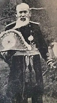 16. 1 2 Ogawa, Kandai (April 18, 2014). "「葦原将軍」というトリックスター 稀代のニセ軍人が愛された理由" [Trickster "Ashiwara Shōgun": Why the Rare Fake Military Man Was Loved]. 昭和「軍人」列伝 [Biographies of Showa-Era Military People]. 別冊宝島 (in Japanese). Vol. 2156. Takarajimasha. p. 104. ISBN 978-4800225238. 葦原の「将軍」の自称は、日露戦争の勝報を聞いてますます過激になっていく。長いひげを伸ばし、どこからか手に入れた将軍の礼服を着た姿はそれなりに堂々としており、(...)