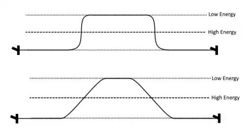 Pure-edge and screw dislocations are conceptually straight in order to minimize its length, and through it, the strain energy of the system. Low-angle mixed dislocations, on the other hand, can be thought of as primarily edge dislocation with screw kinks in a stair-case structure (or vice versa), switching between straight pure-edge and pure-screw dislocation segments. In reality, kinks are not sharp transitions. Both the total length of the dislocation and the kink angle are dependent on the free energy of the system. The primary dislocation regions lie in Peierls-Nabarro potential minima, while the kink requires addition energy in the form of an energy peak. To minimize free energy, the kink equilibrates at a certain length and angle. Large energy peaks create short but sharp kinks in order to minimize dislocation length within the high energy region, while small energy peaks create long and drawn-out kinks in order to minimize total dislocation length.[2]