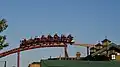 The Motorcycle Chase, a modernized steeplechase rollercoaster built in 1976 by Arrow Development, featured single motorbike-themed vehicles racing side-by-side, each on one of four parallel tracks, launched together.[25] One or two riders straddled each "Indian motorcycle" attraction vehicle. The tubular steel monorail track closely followed dips and bumps in "the road" and tilted to lean riders about the curves. Gasoline Alley, an electric steel-guide rail car ride below, was built together and intimately intertwined, which enhanced ride-to-ride interaction thrill value.[28] Rider safety concerns of the high center of gravity coupled with the method of rider restraints caused it to be rethemed Wacky Soap Box Racers with vehicles themed to look like soap box racers, each seating two riders, strapped in low (nearly straddling the track), surrounded by the close-fitting car sides, and the dips and bumps of the track were straightened flat in 1980. Motorcycle Chase/Wacky Soap Box Racers was removed in 1996 for a dueling loop coaster Windjammer Surf Racers and now Xcelerator, a vertical launch coaster, takes its place.