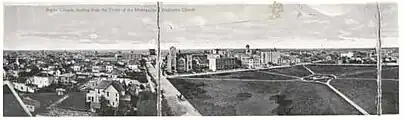 Both Knox Presbyterian and Metropolitan Methodist’s buildings were destroyed by the Regina Cyclone of 1912. The congregational website in 2012 mentioned it, "We have a lot of history behind us at the corner of Victoria Avenue and Lorne Street in Regina. Our building was once knocked down by the tornado of 1912, but we got back up again."[4] Both church buildings were soon rebuilt; "(ironically,...Portnall collaborated on a revised design when...Metropolitan Methodist was destroyed by a tornado...."[5] before the economic demands of the First World War, which erupted in 1914 and which Canada immediately joined though the US remained neutral until 1916.