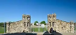 The football stadium is the second WPA project. It was dedicated in 1939 and completed the following year. The stadium is located in the drained reservoir. It is composed of a grass playing field surrounded by a cinder track, two gateway structures with castellated stone towers that double as ticket booths, a stone storage building, sections of a stone retaining wall, and two sets of bleachers. The concession stand and press box were built in 1990, and are not considered historical.[2] The same is true for the retaining wall at the north end of the field, which replaced the original stone wall in the mid-1960s.