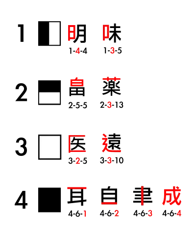 - Main category (in this case, 4 for whole kanji)