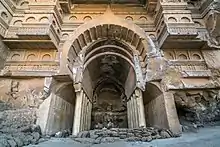 The Kondana Caves are located in the small village of Kondana, 33 km (21 mi) north of Lonavala and 16 km (9.9 mi) northwest of Karla Caves. This cave group has 16 Buddhist caves. The caves were excavated in first century B.C. The construction on wooden pattern is notable.[1] One can reach the cave by descending from Rajmachi village.[2]