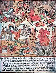 The Koren Bible has as its immediate prototype that of the Kievan, Iereia Prokopii's, apocalyptic woodcut series (1646–1662).[3] Prokopii's Apocalypse in turn follows the Luther-Piscator iconography, and the Piscator Bible draws on the original Albrecht Dürer iconography. The connection to Prokopii is evident, not just deduced from the close correspondence of the iconography in most of the pictures, but from the fact that each of Kineshemtsev's pictures bears the number of the corresponding print in the Prokopii Apocalypse. In one instance, where Kineshemtsev combined elements from two pictures of Prokopii's series, that print bears both numbers.[4] Although Kineshemtsev more or less follows Prokopii's iconography in all his drawings, his artistry is unique and far superior to Prokopii's. Prokopii can be said to have done half the work of adapting Dürer to the Old Russian style, while Kineshemtsev made of them "freski-lubki." For example, the figures become more icon-like and certain folk design elements are introduced, a grainfield is substituted for a cityscape, and the prophets Enoch and Elijah are introduced, .