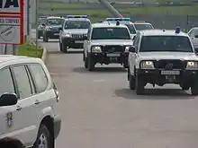 The Road Traffic Division is responsible for general traffic safety. They conduct patrols and attempt to prevent road accidents by enforcing the traffic laws, escort the transportation of hazardous materials, monitor the highways, and they are the first responders in case of traffic accidents. They additionally inspect the road infrastructure and make recommendations to the local and national authorities with regards to improvements that would reduce the possibility of accidents.[8]