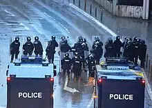 In November 2022, during the 2022–2023 North Kosovo crisis, around 300 Serb policemen in the north of Kosovo resigned en masse as a form of protest against the ban on Serbian car plates by the Kosovo Government, leaving the north with effectively no active police force.[5] The Kosovo government reacted by temporarily replacing the resignees with Albanian policemen, which resulted in protests by the local Serb population. The Kosovo Police responded by opening a call for applications for ethnic minorities to replace the resignees.[6]