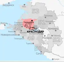 | Districts | Dinskoy (Novovelichkovskoye, Novotitarovskoy, Yuzhno-Kubanskoye), Kalininsky, Krasnoarmeysky, Krasnodar (Berezovsky, Kalininsky, Prikubansky, Yelizavetinsky), Timashyovsky[1] |