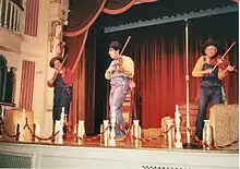 Wall, who got his start in show business as a comedian, said he geared his jokes to adults in the crowd more than the children. "The kids might not get the jokes," Wall said, "but they at least get a kick out of seeing their mom and dad crack up." A sometime Elvis impersonator, Wall noted that Disney did not prohibit him, or any other Disney musician, from pursuing side projects.[5] One such show took place in Buffalo, New York in 1997 as part of the Buffalo Philharmonic Orchestra's TGIF series. According to Mary Kunz of Buffalo News, the group performed classical pieces together with the orchestra which "proved how much bluegrass and classical music have in common". After intermission, the band re-emerged dressed in overalls, "like some kind of Appalachian Marx Brothers", and performed another hour of country standards including "Hey Good Lookin'", "Tennessee Waltz", and "Orange Blossom Special".[6]