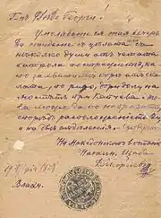 The Edinstvo Committee in the town of Gorna Dzhoumaya played an important part in organizing, supplying and assisting the Uprising. The committee was headed by Kostantin Bosilkov, who was born in the town of Koprivshtitsa and who had worked for many years as teacher in the Macedonia region. The main goal of the armed struggle though, was expressed most clearly in the letter of the Melnik rebels of December 11, 1878, which they sent to the chief of the Petrich police: "...We took up the arms and will not leave them until we get united with the Bulgarian Principality..."[13] This aim was also expressed in the appeal launched by the insurgents on November 10, 1878, which read: "...And so, brothers, the time has come to demonstrate what we are, that we are a people worthy of liberty, and that the blood of Kroum and Simeon is still flowing in our veins; the time has come to demonstrate to Europe that it is no easy task when a people want to cast away darkness."[14] During the military operations in the Kresna region, an uprising broke out on November 8, 1878, in the Bansko-Razlog valley. The detachment of volunteers from Moesia, led by Banyo Marinov, a revolutionary and volunteer from the Russo-Turkish War (1877–1878), played an important part in that uprising. It was promptly joined by scores of local insurgents and, after a fierce skirmish, it succeeded in liberating the town of Bansko. The setbacks in the autumn of 1878 led to a new organization of the leading body of the Uprising and to the adoption of new tactics. Efforts were now directed toward the setting up of a Central Committee which was to take over the leadership of the Uprising, as well as to organize an uprising in the interior of Macedonia in the spring of 1879. The detachment which crossed into Macedonia in May 1879 could not fulfill its task due to the lack of preliminary organization. These events marked the end of the Kresna–Razlog Uprising.