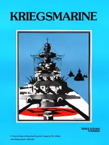 Between 1978 and 1980, SimCan published three naval wargames using similar rules and identically scaled maps: IJN (1978, Pacific combat in WW II); Torpedo (1979, WW II submarine warfare); and Kriegsmarine, a game designed by Stephen Newberg and published by SimCan in a ziplock bag in 1980 with cover art by Rodger B. MacGowan.[2] It was notable for the misspelled title "Kreigsmarine" on the rulebook and map. The game was also published as a boxed set. In total, SimCan printed 2000 copies of Kriegsmarine.[2]