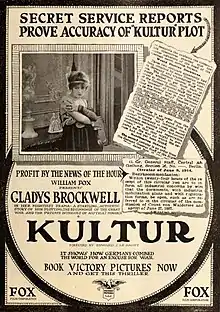 Kultur is a 1918 American silent film directed by Edward J. Le Sainte starring Gladys Brockwell in the lead role as Countess Griselda Von Arenburg. No copies of the film are known to exist per the Library of Congress.[1]