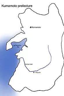 The Kuma River and its watershed covers nearly 25% of the entire area of Kumamoto Prefecture, and it is the largest river in the prefecture.[3] The Kuma River begins its course from Mount Choushigasa flowing primarily through Kumamoto prefecture, leading to the Yatsushiro Bay. It is the only major and the largest river connected to the Yatsushiro sea. Before flowing into the Yatsushiro sea, where a large tidal flat is formed at its river mouth. Before flowing into the Yatsushiro sea, the Kuma River flows through the Hitoyoshi city, the Kuma village and the Yatsushiro city.[4] The Kuma River flows through the Shimanto terrane and mainly through the Chichibu terrane.[5] The Kuma River has 80 tributaries with its combined total length of 434 km. One of the major tributaries of Kuma River is Kawabe River, joining Kuma river at Hitoyoshi city, Kumamoto prefecture.[5] The sediments of Kuma River originate from the Chichibu terrane and the Higo volcanic.[6]