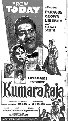 Kumara Raja (transl. Prince) is a 1961 Indian Tamil-language film directed by G. K. Ramu. The film stars J. P. Chandrababu, T. S. Balaiah and M. N. Rajam.[2] It was released on 21 April 1961.[3]
