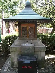 Kume no Heinai-dō (久米平内堂) is a small folk shrine located in Asakusa in Taitō, Tokyo. The shrine houses a stone statue of Kume no Heinai, a samurai from the early Edo period (17th century). According to the Asakusa tourism bureau, there are few facts about the life of Kume no Heinai, but he is said to have died in 1683. Oral tradition holds that Heinai excelled in Kenjutsu, the martial art of swordsmanship, killing many people over the years. In the latter half of his life, he is said to have lived in the Sensō-ji temple in Asakusa where he devoted himself to Zen-Buddhism and held religious services in honor of the people he killed. Shortly before his death he ordered his followers to carve his likeness on a stone and bury it near the Niōmon – the entrance to the Buddhist temple and a busy district in the city. His wish was to have his statue be stepped on by as many people as possible in order to expiate the crimes he committed in life. The statue was eventually retrieved and is now stored inside the shrine itself. It is because of this that the shrine initially carried the name Fumitsuke (踏みつけ), which means "to tread on", but over time the meaning was lost and the shrine's name came to be spelled 文付け, which means "love letter". Both words are pronounced Fumitsuke and the shrine is now worshipped by the general public as a deity of marriage and match-making. Kume no Heinai-dō was destroyed in March 1945 during World War II. The current temple was rebuilt in October 1978.