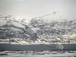 ![]() Kvaløya seen from Tromsøya; the Sandnessund Bridge connects the two islands. (March 2006) | |