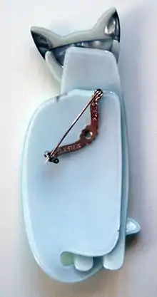 The brooches were made in two periods: vintage (1969 to 1981) and modern (1991 —). Each brooch has a distinctive v-shaped metal clasp inscribed with 'Lea Stein Paris'. Some collectors suggest that the clasp determines which era it was made in. Vintage brooches had the clasps heat mounted into the plastic; in modern brooches, the clasps are riveted on. Some early brooches had v-shaped clasps without the 'Lea Stein' inscription.[4] However, other collectors suggest this is not true. The only way to discern vintage from modern is to have an extensive knowledge of Stein's designs.[3][8][9]