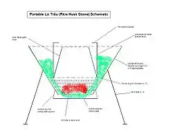The timeline of the development of the lò trấu is unclear, however, it is known that the Lo Trau has been in use in Vietnam at least since the 1950s. The fixed version Lo Trau stove is thought to be strongly related to the Castrol stove design of the architect François de Cuvilliés in 1735 and similar European designs in the 1830s, with flue pipes connected to the chimney, oven holes into which concentric iron rings on which the pots were placed. Depending on the size of the pot or the heat needed, one could remove the inner rings. A recent innovation is the portable Lo Trau. Its compact design and efficient operation has been the target of a number of studies.[1][2][3][4][5] Recently it has been distributed in the Negros area of the Philippines in The Southern Negros Sustainable Agriculture Demonstration Projects in the 1990s.[1] This relatively late uptake of apparently long-used innovation means the potential of rice husk as fuel has been overlooked by many for a long time, as well as the obscurity of the Lo Trau designs to the wider world.