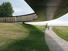 On the source of his inspiration, Prost explains, "I was thinking about the rings you make when you're a child, or a human ring when everyone holds each others' hands in a sign of fellowship, and that seemed to me like the image, the form best suited to speaking about these 600,000 soldiers killed in the Nord-Pas-de-Calais region, and who today are brought together all in one place."[10] The elliptical shape of the monument captures this sentiment and evokes a sense of "posthumous fraternity"[11] and unity among countries that were once enemies. It draws no lines, makes no distinctions, and instead recognizes a common and inclusive humanity. The memorial invokes a sense of European loss rather than strictly national loss.