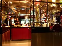 The decor of the restaurant has been described as "contemporary chic featuring lush red velvet seating complemented by dark wood furniture."[1] Like the Tokyo restaurant, L'Atelier de Joël Robuchon of Hong Kong is divided into two areas – L'Atelier and Le Jardin.[2] The seats of L'Atelier are in a square around the open kitchen, in a manner similar to a sushi restaurant.[3] The restaurant has an extensive wine collection, and was awarded the Wine Spectator's "Grand Award" in 2010.[1] As of 2020, there are eight L'Atelier de Joël Robuchon restaurants around the world.[4]