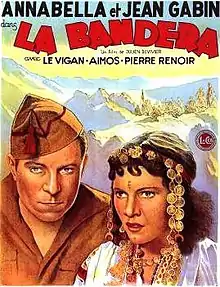La Bandera (released in the United States as Escape from Yesterday) is a 1935 French drama film directed by Julien Duvivier and starring Annabella, Jean Gabin and Robert Le Vigan. It was based on the 1931 novel La Bandera by Pierre Mac Orlan. After committing a brutal murder in Paris, a Frenchman flees to Barcelona where he enlists in the Spanish Foreign Legion. He is sent to fight in Morocco where he unexpectedly bonds with his comrades and marries a local woman before his past begins to catch up with him. Like Duvivier's other works of the period, the film is infused with poetic realism.