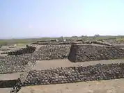 On the eastern side are two large pyramidal structures. The one in the middle only has three levels, the fourth was lost by a modern building at the top; it was built on a rectangular base 25 m per side, has a stairway at the center with side walls. Combines sloped walls with intermediate passages between the different bodies. On top was a compound or altar where priests probably performed rituals. This is deduced from the amount of offerings and artifacts found in the area.