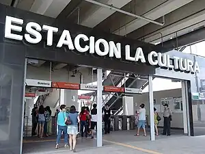 La Cultura is a Lima Metro station on Line 1. The station is located between San Borja Sur and Arriola. It was opened on 11 July 2011 as part of the extension of the line from Atocongo to Miguel Grau.[1] The full revenue service started on 3 January 2012.[2][3]