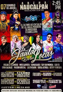 La Jaula de Las Locas (Spanish lit. "The Cage of the Crazy Ones", a reference to the Spanish title of La Cage aux Folles) was a special professional wrestling event produced by the International Wrestling Revolution Group (IWRG), that took place on June 7, 2019 at Arena Naucalpan in Naucalpan, State of Mexico. The focal point of the show and the inspiration for the event name was the main event steel cage match, an inter-gender match that saw both female wrestlers and male Exótico (drag wrestlers) compete against each other. The cage match was contested under Luchas de Apuestas, or "bet match", rules where the last wrestler in the cage would be deemed the loser, losing either their wrestling mask or their hair if they were already unmasked.