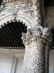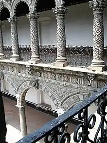 The cloister is noted for its mix of Baroque and Mudéjar elements,[1] and has been called one of the most beautiful monasteries built in Mexico because of its elaborate decoration.[1][2][4] In the middle is a patio, surrounded by two floors of columns with arches, behind which are walkways. A large staircase leads to the upper floor and tower next to the street. On each of the four sides of the patio, the seven ground-floor columns divide into fourteen upper-floor columns. The ground-floor columns are of Doric style and the keystones of each of the arches bear medallions with images of apostles or Mercedarian friars.[1] The columns of the upper floor, built later, have more decoration than the lower.[4] These columns are decorated with lattices intertwined with foliage and fruit.[1][2] The spaces between the pilasters are decorated in Baroque style, with sculpted images of Mercedarian friars in the triangles that extend from the arches to the ceiling.[2] On the undersides of the arches, small pyramids point downwards.[1][2]