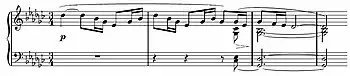 The piece begins with its well-known opening theme consisting of three-note phrases,[17] grouped together as one eighth note and two sixteenth notes. It finishes with chords that form a plagal cadence between bars 2 and 3,[18] an element that is not featured in his previous preludes. The second part of the melody enters in bars 3–4, evoking a Scottish ballad or resembling a tune in the style of Edvard Grieg.[17] The melody from the opening returns in bar 8 with added harmony in the left hand. At bar 19, the melody begins its ascent to the climax of the piece, gradually building up through the use of crescendo to propel it to peak at the end of bar 21. Near the end of bar 22, the melody diminuendos to the subsequent measure, where the theme of the climax is repeated an octave lower. A pianissimo drone-like part that moves in parallel motion—featuring consecutive fifths in some places—comes in at bars 24 to 27. In the next measure, the prelude's coda sees the return of the opening theme one last time—albeit at an octave higher—followed by the droning motif.[14] Finally, the melody ascends in parallel movement and makes use of a final plagal leading cadence to get to the home key chord in root position. This cadence neither "melodically anticipates the arrival pitch"[18] nor does it include the tonic in the left hand. Thus, it has been described as "the ideal harmonization of the plagal leading tone."[18] The melody ends with two arpeggiated octave chords (D♭ in the left hand followed by G♭ in the right), bringing the prelude to a close.[14]