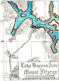 The British award of 1902[1] considered the demands of Chile and Argentina as irreconcilable and previous authorization of both governments draw a boundary between the extreme pretensions of the litigants. In the Laguna del Desierto region, the tribunal set the hito 62 (cornerstone 62) at the O'Higgins/San Martin Lake and draw the boundary from there to mount Fitz Roy on the Martínez de Rozas Range awarding Chile the complete valley of Laguna del Desierto.