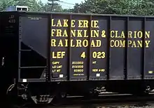 The Lake Erie, Franklin, and Clarion Railroad (reporting mark LEF) was a fifteen mile long short line that ran from a Conrail connection at Summerville, Pennsylvania, to Clarion, Pennsylvania, the county seat of Clarion County, and included a short branch from Sutton to Heidrick. The road was incorporated in 1913 as a consolidation of several other railroads, the Pennsylvania Northern, Pennsylvania Southern, and the Pittsburgh, Clarion and Franklin, which itself was formed from the Pittsburgh, Summerville, and Clarion [which began operation in 1904 and was leased to the Pennsylvania Southern in 1910. Length peaked at about 80 miles of track in around 1924. The corporate name was somewhat optimistic: the railroad never reached either Franklin or Lake Erie.