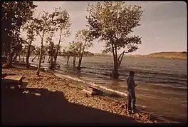 A small settlement called "Lahontan" once stood near the reservoir, which in 1940 the Federal Writers' Project reported had a population of 25.[1]